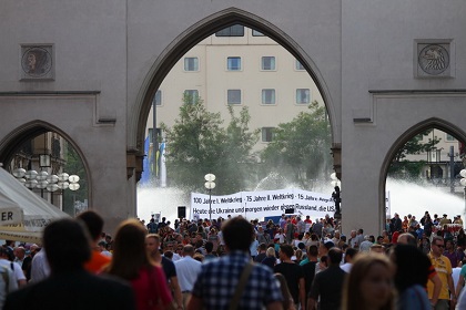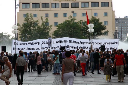 Veranstaltet vom "Münchner Bündnis gegen Krieg und Rassismus" wurde die Kundgebung unter dem Motto "Stoppt den Griff nach der Ukraine – Keine Komplizenschaft mit Faschisten" von verschiedenen Organisationen, Parteien und gewerkschaftlichen Arbeitskreisen unterstützt. Es herrschte ein "Kaiserwetter" wie zu Beginn des Ersten Weltkrieges, als wollte es das Kulminieren der heißen Juli-Krise von 1914 noch einmal vor Augen führen.