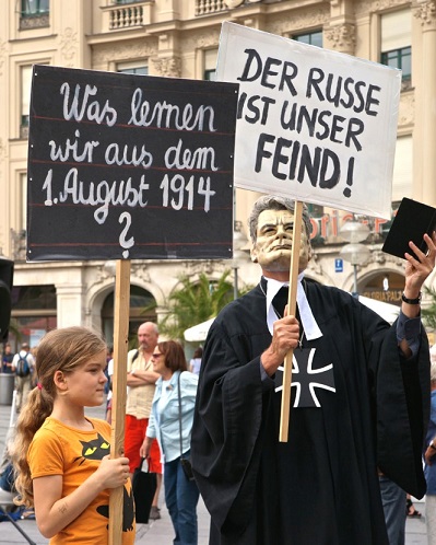 Den optischen Leckerbissen bot der "Bundesprediger" in Talar und Maske, der die Frage auf der Tafel eines kleinen Mädchens "Was lernen wir aus dem 1. August 1914?" drakonisch beantwortete mit seinem Schild: "Der Russe ist unser Feind". Darin waren sich alle auf dem Platz einig: Man muss nicht "Putin-Versteher" sein, um die gefährliche, verbrecherische, russlandfeindliche Politik des Westens zu durchschauen und zu durchkreuzen – trotz diverser teils erheblicher Differenzen in der Einschätzung der Strategien und divergierenden Interessenslagen der NATO-Staaten.