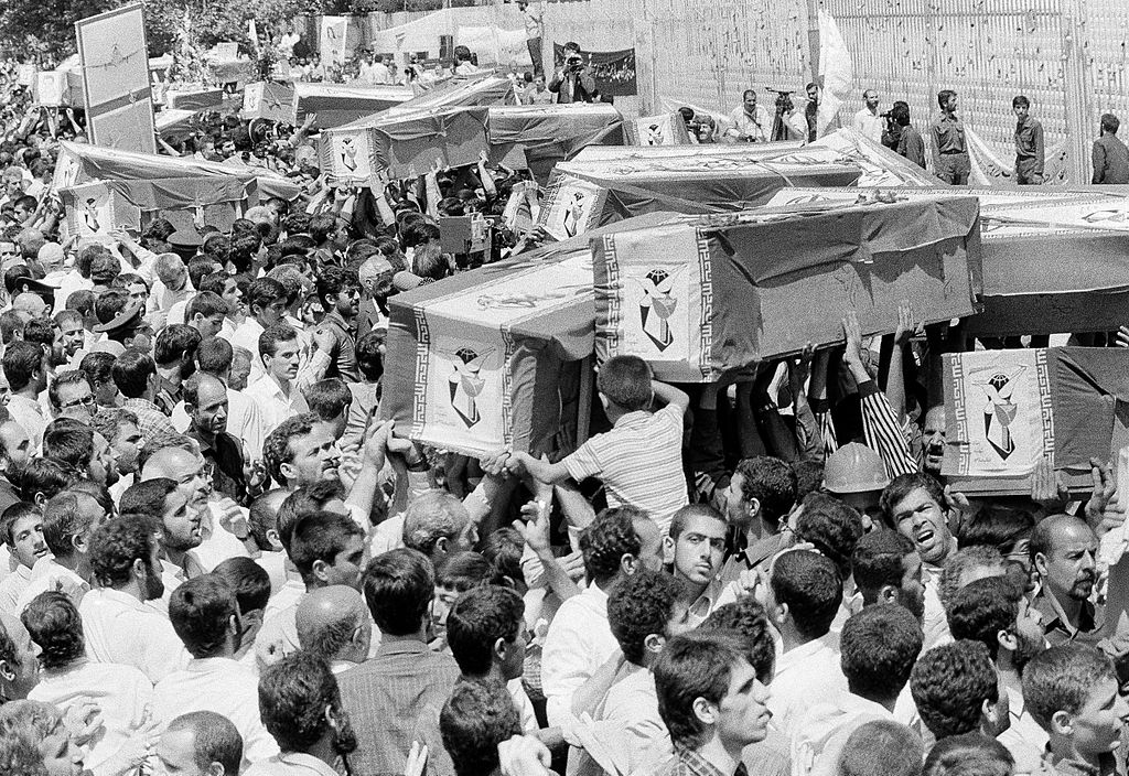 2. Trauerfeiern in Teheran, Iran, am 7. Juli 1988 anlässlich des Abschusses der zivilen Maschine Iran-Air-Flug 655 (IR655). Es war Linienflug der Iran Air von Teheran über Bandar Abbas, Iran nach Dubai in den Vereinigten Arabischen Emiraten. Am 3. Juli 1988 wurde diese Route von einem Airbus A300B2 mit der Kennnummer EP-IBU geflogen. Die Maschine wurde auf der zweiten Teilstrecke des Fluges über dem Persischen Golf nahe Qeschm vom US-Kriegsschiff USS Vincennes (CG-49) abgeschossen, wobei alle 290 Menschen an Bord getötet wurden. Nach Angaben der US-Regierung war das Flugzeug von der Schiffscrew als eine angreifende, feindliche F-14 Tomcat identifiziert worden.