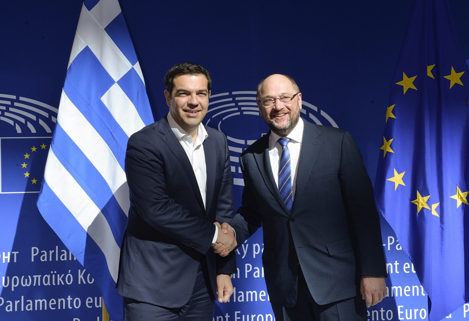 1. ALEXIS TSIPRAS, Premierminsister Griechenlands und Chef von SYRIZA, beim fotogenen Händeschütteln mit Martin Schulz. Die Fraktion der Progressiven Allianz der Sozialdemokraten im Europäischen Parlament wählte in ihrer Sitzung am 18. Juni 2014 in Brüssel Martin Schulz zum Vorsitzenden der Fraktion. Dieses Amt legte er nieder, als er am 1. Juli 2014 mit 66,8 % erneut zum Präsidenten des Parlaments gewählt wurde. Tsipras hält die vorläufigen EU-Beschlüsse in der völlig verfehlten Flüchtlingspolitik für einen Schritt in die richtige Richtung.