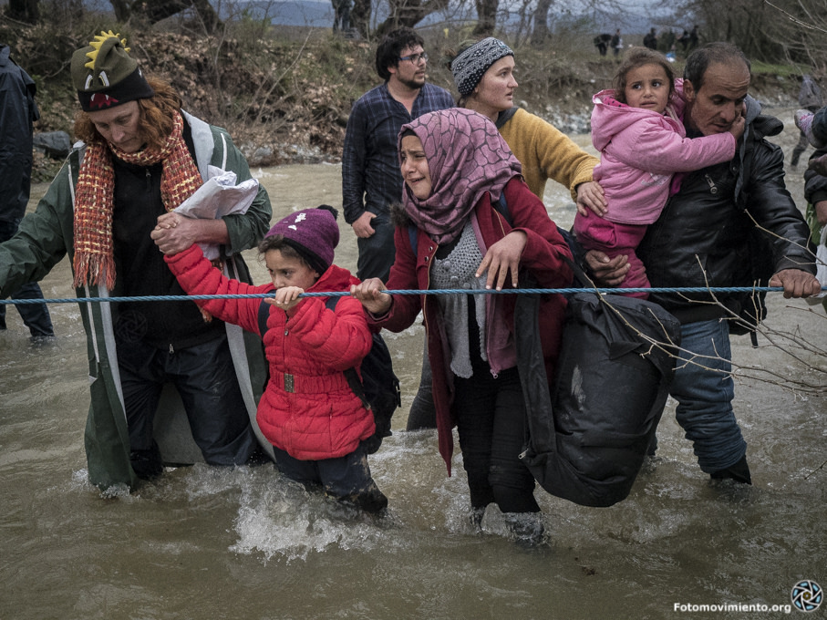 8. Flussüberquerung von Flüchtlingen bei Idomeni - 1. Idomeni ist ein Ortsteil der Gemeinde Peonia in der nordgriechischen Region Zentralmakedonien. Es bildet gemeinsam mit zwei kleineren Dörfern die gleichnamige Ortsgemeinschaft. Das Dorf hat einen Grenzbahnhof zur Republik Mazedonien an einer wichtigen europäischen Bahnstrecke. Seit 2014 kommen Flüchtlinge aus Syrien und vielen anderen Ländern nach Idomeni, um dort die Grenze nach Mazedonien zu überschreiten (eine der Balkanrouten). Norbert Blüm, ein ehemaliger Arbeitsminister Deutschlands, übernachtete im Camp in der Nacht vom 12. auf den 13. März 2016, um seine Solidarität mit den Flüchtlingen im Flüchtlingslager zu bekunden. Foto: Fotomovimiento. Quelle: Flickr. Verbreitung mit CC-Lizenz Namensnennung - Nicht-kommerziell - Keine Bearbeitung 2.0 Generic (CC BY-NC-ND 2.0).