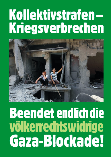 1. Texttafel: "Kollektivstrafen - Kriegsverbrechen: Beendet endlich die völkerrechtswidrige Gaza-Blockade!" Grafik: Wolfgang Blaschka, München