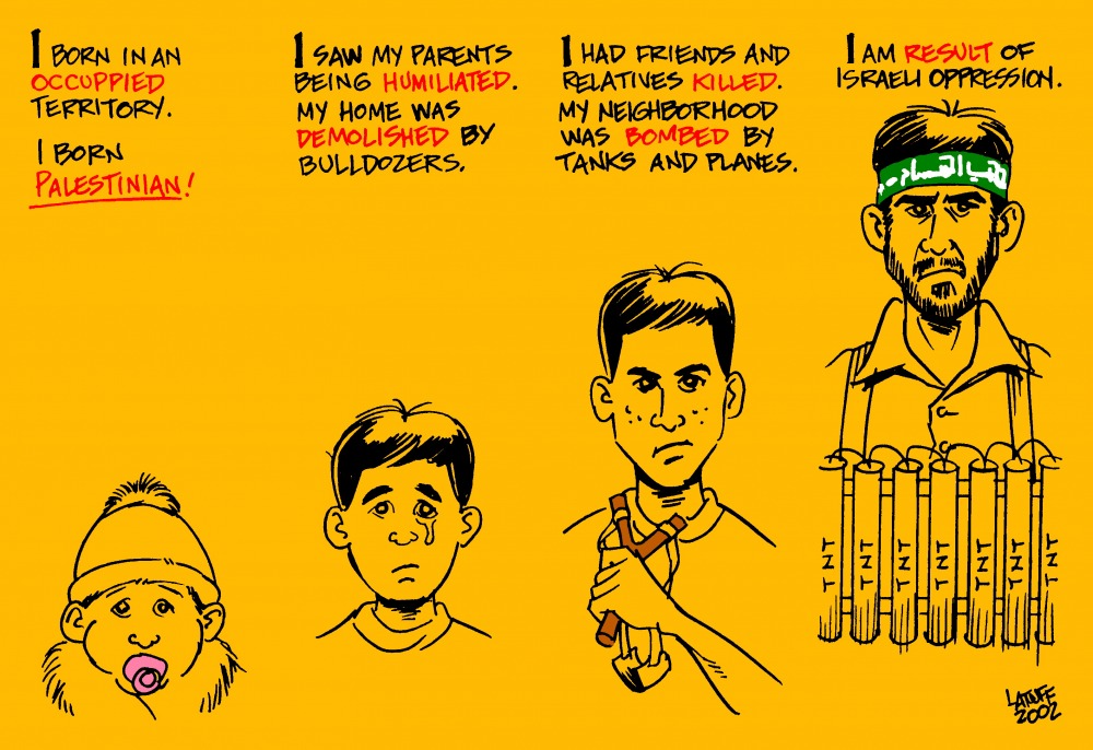 4. "I AM RESULT OF ISRAELI OPPRESSION" Karikatur von Carlos Latuff, einem "Politischen Karikaturist", geboren November 1968 in Rio de Janeiro, Brazil. Quelle: Wikimedia Commons. Dieses Werk wurde von seinem Urheber Carlos Latuff als gemeinfrei veröffentlicht. Dies gilt weltweit. Carlos Latuff (eigentlich Carlos Henrique Latuff de Souza) gewährt jedem das bedingungslose Recht, dieses Werk für jedweden Zweck zu nutzen, es sei denn, Bedingungen sind gesetzlich erforderlich. Sein Blog > latuffcartoons.wordpress.com