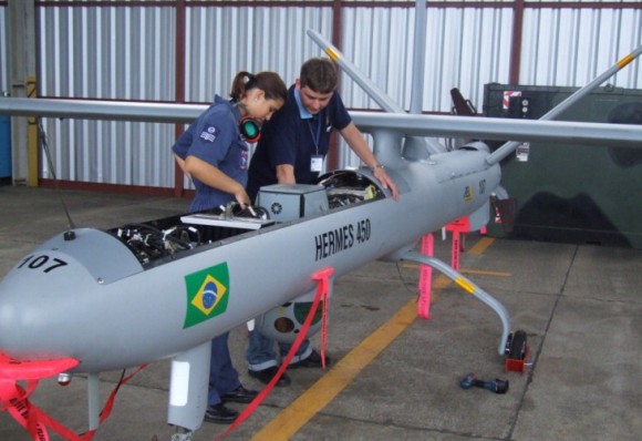 Techniker warten eine Hermes 450-Drohne der brasilianischen Streitkräfte (Bildquelle)