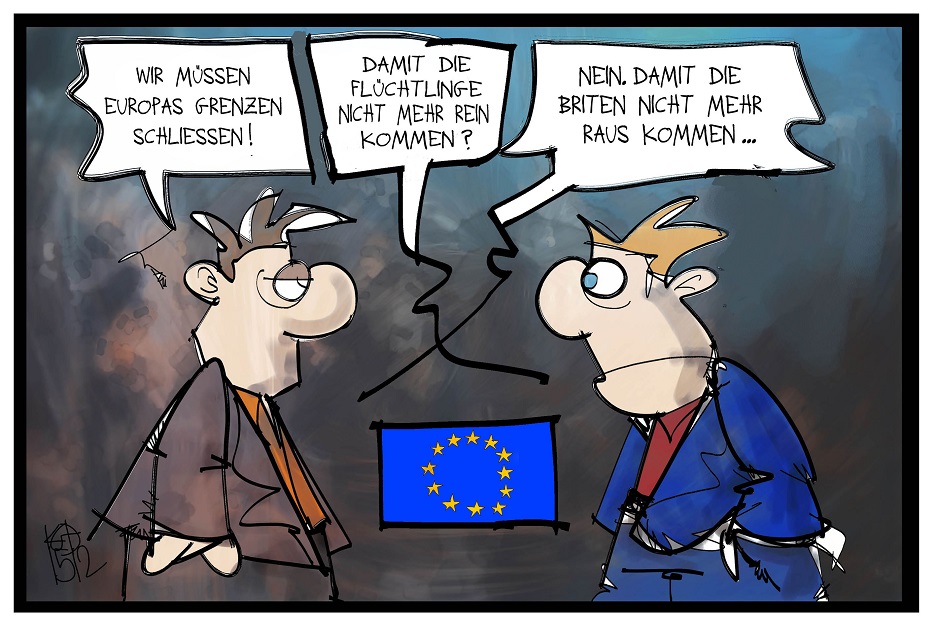 3. Karikatur: "Wir müssen Europas Grenzen schliessen!" "Damit die Flüchtlinge nicht mehr rein kommen?" "Nein, damit die Briten nicht mehr raus kommen." Karikatur von Kostas Koufogiorgos. Koufogiorgos wurde 1972 in Arta, Griechenland geboren, studierte nach dem Abitur 1989 Wirtschaftswissenschaften an der Universität von Athen und begann zeitgleich als Karikaturist für verschiedene griechische Zeitungen und Magazine zu arbeiten. Seit dem Umzug 2008 nach Deutschland veröffentlicht er seine Karikaturen in verschiedenen Tages-, Wochen- und Online-Zeitungen. Des Weiteren findet man seine Arbeiten in Magazinen (z. B. „Nebelspalter“, „Der Spiegel“), Fach- und Gewerkschaftszeitungen (z. B. „Allgemeine Hotel und Gastronomiezeitung“, „vida“), Onlineportalen (z.B. „web.de“, „gmx.de“), und Bildungsmedien.