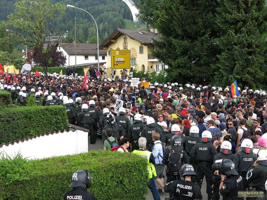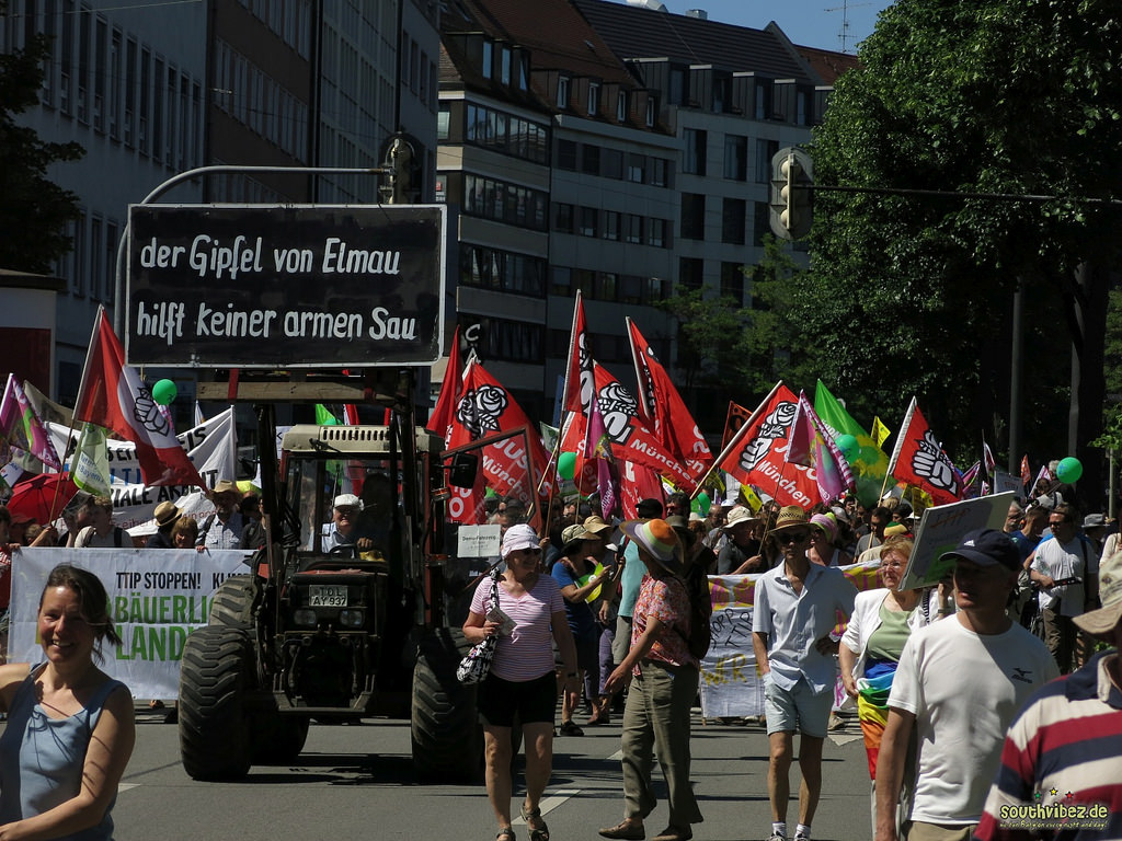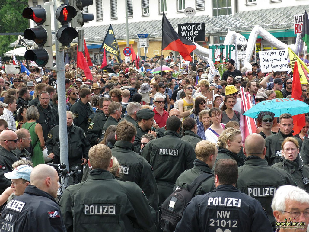 Wie bei allen anderen „großen Gipfeln“ der letzten Jahre waren auch die G7 Gegenstand von Gegenaktionen und Mobilisierungen. Hier zeigte der Staat seine wahre, repressive Seite. Unter fadenscheinigen Bedingungen sollte das Protestcamp in Garmisch-Partenkirchen verboten werden. Zum Schutz der Sieben wurden zehntausende Polizisten zusammengerottet – die „persönlichen“ Sicherheitskräfte von Obama und den anderen Staatsgästen nicht mitgerechnet. Allein der US-Präsident brachte 500 eigene Securities mit.
