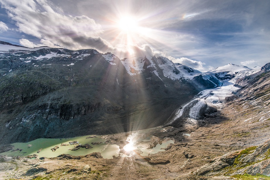 2. Double Star - The sun is reflected in the lake left by the retreating glacier Pasterze. Only about ten years ago, the Pasterze would still have extended to the left border of the image. The Pasterze, the longest glacier in Austria, lies within the Hohe Tauern mountain range in Carinthia. The Pasterze is the fastest-dying Glacier in the Alps. In 2013 it lost about 100 meters of its length. The summit of the Grossglockner, Austria's highest mountain (3,798 m = 12,461 ft) hides behind clouds.