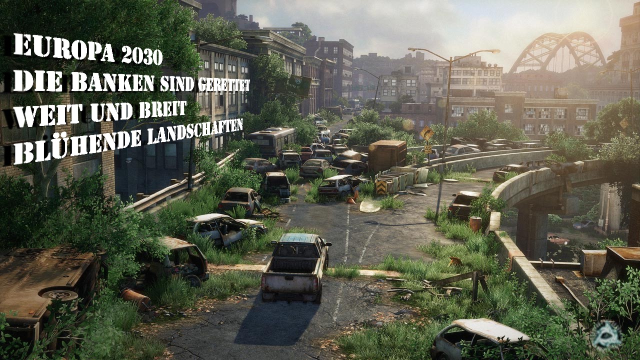 8. EUROPA 2030: Wirtschaftswachstum und Bankenrettung bis zum finalen Kollaps. Das Leben in den Megastädten ist ein krankes Leben. In den Städten beginnt der Fäulnisprozess, wenn die zurückgehaltene Aggression nicht raus kann. Wenn der Mensch näher an seiner biologischen Quelle ist, näher an den Pflanzen, näher an den Tieren, dann ist er gesünder, dann lebt er sein Leben gesünder. Bildbearbeitung: Jan Müller / Borgdrone.de. Dieses digital bearbeitete Werk von borgdrone ist lizenziert unter einer Creative Commons Namensnennung – Keine Bearbeitungen 4.0 International Lizenz. (Originalbild: Naughty Dog / Sony)