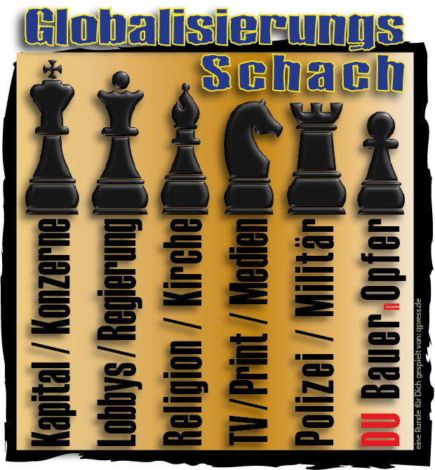 1. Globalisierungsschach: Kapital / Konzerne, Lobbys / Regierung, Religion / Kirche, TV / Print / Medien, Polizei / Militär, Du Bauern Opfer. Grafikbearbeitung: Wilfried Kahrs / QPress.de .