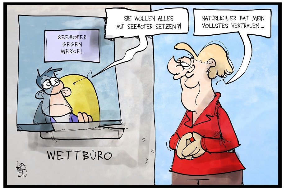 3. SEEHOFER vs. MERKEL. Karikatur von Kostas Koufogiorgos.  Koufogiorgos wurde 1972 in Arta, Griechenland geboren, studierte nach dem Abitur 1989 Wirtschaftswissenschaften an der Universität von Athen und begann zeitgleich als Karikaturist für verschiedene griechische Zeitungen und Magazine zu arbeiten. Seit dem Umzug 2008 nach Deutschland veröffentlicht er seine Karikaturen in verschiedenen Tages-, Wochen- und Online-Zeitungen. Des Weiteren findet man seine Arbeiten in Magazinen (z. B. „Nebelspalter“, „Der Spiegel“), Fach- und Gewerkschaftszeitungen (z. B. „Allgemeine Hotel und Gastronomiezeitung“, „vida“), Onlineportalen (z.B. „web.de“, „gmx.de“), und Bildungsmedien.