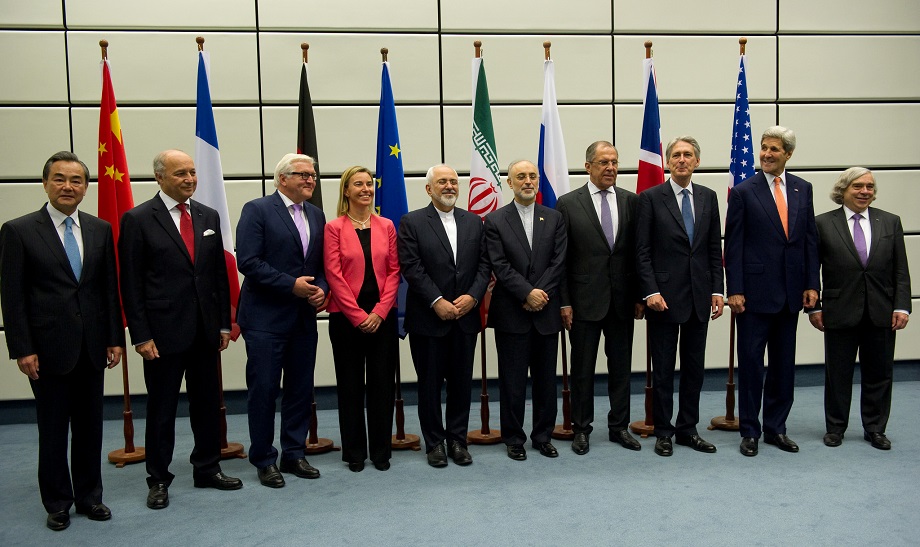 Personen auf dem Foto von links nach rechts: der chinesische Außenminister Wang Yi, der französische Außenminister Laurent Fabius, der deutsche Außenminister Frank-Walter Steinmeier, die EU-Außenbeauftragte Federica Mogherini, der iranische Außenminister Mohammad Dschawad Zarif, der Vorsitzende der iranischen Atomenergie-Kommission Ali Akbar Salehi, der russische Außenminister Sergei Lawrow, der britische Außenminister Philip Hammond und der amerikanische Außenminister John Kerry. Mann rechts außen: ?