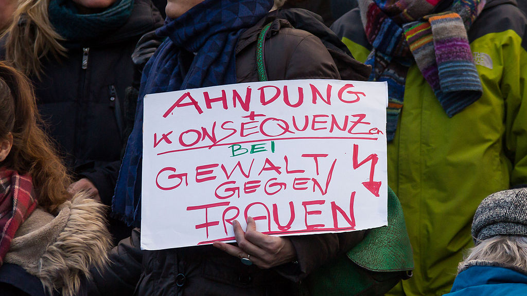 1. Protestschild "AHNDUNG + KONSEQUENZen bei GEWALT GEGEN FRAUEN" - Flashmob gegen Männergewalt auf der Treppe vom Bahnhofsvorplatz Köln hoch zum Kölner Dom in Reaktion auf die sexuellen Übergriffe in der Silvesternacht 2015/2016. Foto: © Raimond Spekking, Software-Berater und freier Fotograf >> https://www.mediawiki-beratung.de/. Quelle: Wikimedia Commons. Diese Datei ist lizenziert unter der Creative-Commons-Lizenz „Namensnennung – Weitergabe unter gleichen Bedingungen 4.0 international“.