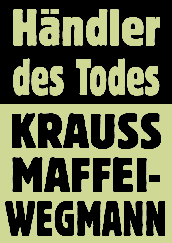 9. Texttafel HÄNDLER DES TODES - KRAUSS MAFFEI-WEGMANN. Grafik: Wolfgang Blaschka (WOB), München.