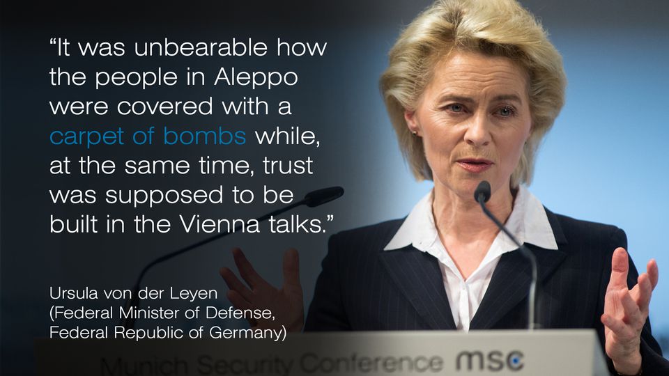2. Ursula von der Leyen - Federal Minister of Defence, Federal Republic of Germany - Munich Security Conference 2016, 13. Februar 2016, 23:10. Foto: © Munich Security Conference 2016 (MSC) / Simon. Quelle: Webseite der Stiftung Münchner Sicherheitskonferenz (gemeinnützige) GmbH. Verbreitung: Fotos der Konferenz, die zum Download angeboten werden, können entsprechend den Angaben im Impressum honorarfrei genutzt werden, soweit der Name des Fotografen genannt wird. Die Fotos sind unter der Creative Commons Attribution 3.0 Germany License lizensiert.