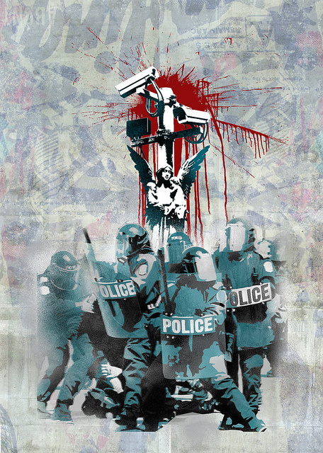 3. Starker Staat? Der mit geschwellter Brust agierende „starke Staat“ provoziert genau das, was er zu verhindern vorgibt: Panik, Terrorangst und das beklemmende Gefühl lähmender Ohnmacht gegenüber einer unfassbaren Bedrohung aus der eigenen Gesellschaft heraus, die ihr hausgemachtes Versagen gern nach außen projiziert und von sich abspalten will, sich damit aber zunehmend nur selbst verstümmelt und verroht. Foto: seven resist. Quelle: Flickr. Verbreitung mit CC-Lizenz Namensnennung - Nicht-kommerziell - Weitergabe unter gleichen Bedingungen 2.0 Generic (CC BY-NC-SA 2.0).