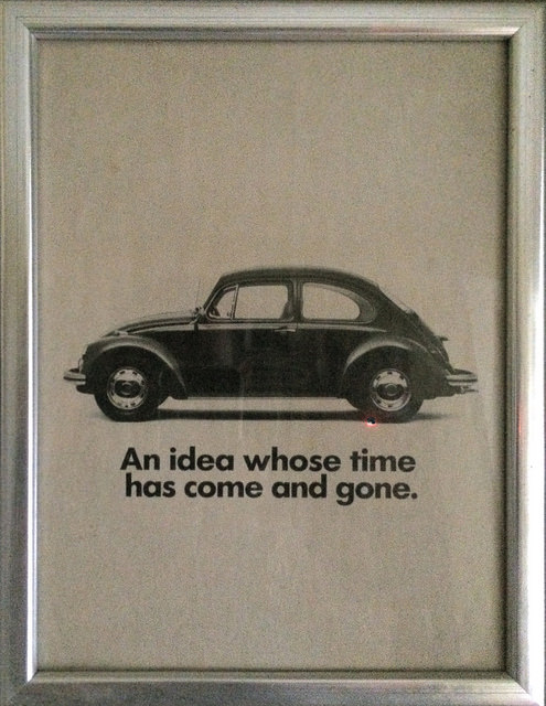 4. VW Käfer / Bug - "An idea whose time has come and gone". An old framed Volkswagen ad from a Life Magazine from about 1974. The ad was to promote the new Volkswagen Rabbit (in North America). I thought the text was funny given the current Volkswagen emissions scandal. Foto: Marc Demers, Montreal. Quelle: Flickr. Verbreitung mit CC-Lizenz Namensnennung - Nicht-kommerziell - Keine Bearbeitung 2.0 Generic (CC BY-NC-ND 2.0).