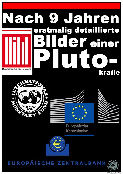 11. Nach ihrem Besuch beim Pluto schickt „New Horizons“ weiter neue Fotos zur Erde. Nun übermittelt die Sonde erstmals detaillierte Bilder einer Plutokratie (EU-Kommission, EZB und IWF). Grafikbearbeitung: Jan Müller / Borgdrone.de. Dieses Werk von borgdrone ist lizenziert unter einer Creative Commons Namensnennung – Keine Bearbeitungen 4.0 International Lizenz.