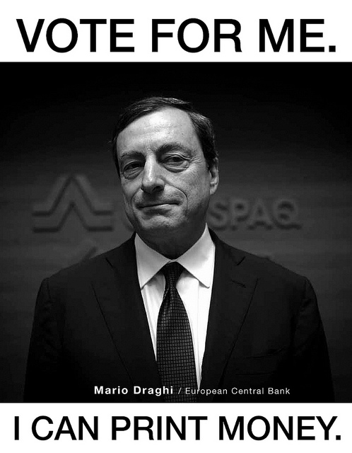 1. "Mario Draghi: "VOTE FOR ME - I CAN PRINT MONEY". Foto: Ondrej Kloucek. Quelle: Flickr. Verbreitung mit CC-Lizenz Attribution-ShareAlike 2.0 Generic (CC BY-SA 2.0).