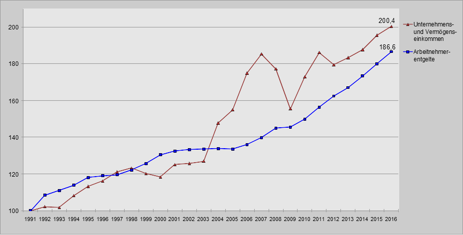 2. Grafik 2: Entwicklung der Arbeitnehmerentgelte und Gewinneinkommen in Deutschland, Indexdarstellung; Basisjahr 1991 (=100). Quelle: Volkswirtschaftl. Gesamtrechnung (VGR) des Statistischen Bundesamts.