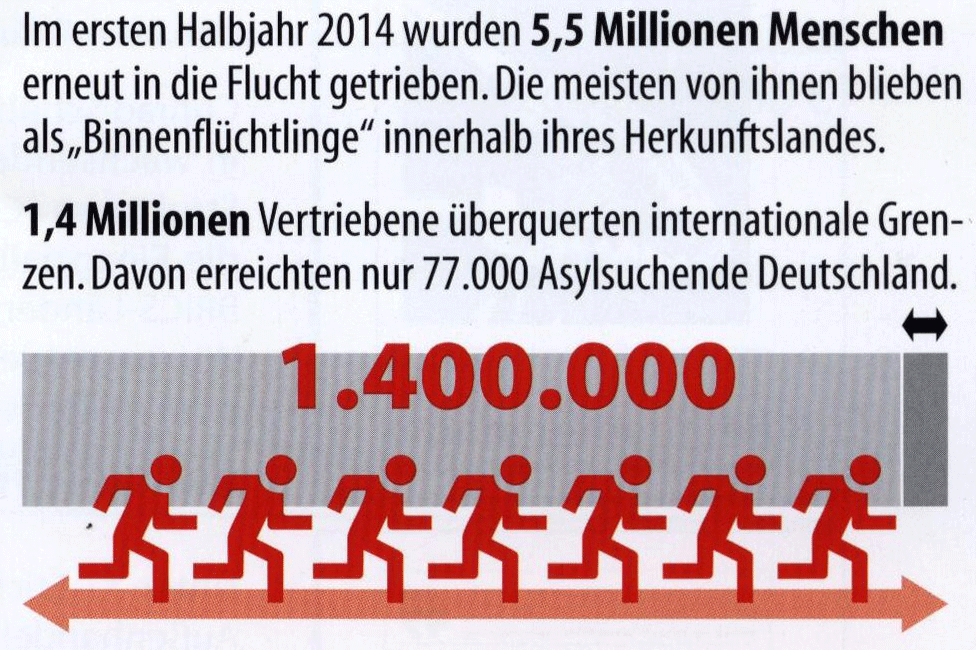 8. Flüchtingssituation: 1.400.000 Vertriebene überquerten internationale Grenzen. Davon erreichten nur 77.000 Asylsuchende Deutschland. Grafik: isw München.