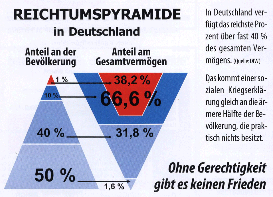 Die soziale Spaltung geht durch die Welt ebenso wie durch die einzelnen Länder – auch die westlichen Industrienationen. Die reichsten zehn Prozent der Welt-Bevölkerung besitzen 50 Prozent der Nettohaushaltsvermögen. Die reichsten zehn Prozent der Deutschen besitzen sogar 60 Prozent der Vermögen. Es hat sich ein privater Reichtum von 53 Billionen US $ in wenigen Händen – knapp 2 Promille der Menschheit angehäuft. Dies ist in verschiedenen Publikationen des isw im Einzelnen nachzulesen. Eine Grafik zum Verdeutlichen am Beispiel unseres Landes: