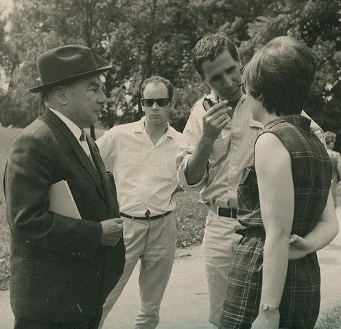 2. Erich Kästner bei Dreharbeiten im Englischen Garten in München mit Kameramann Peter Schneider(Mitte) und Regisseur Georg Armin für den Norddeutschen Rundfunk. Foto: privat. Quelle: Wikimedia Commons. Diese Datei ist unter der Creative-Commons-Lizenz „Namensnennung 3.0 nicht portiert“ lizenziert.