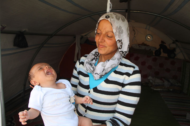 Um die bedrückende Atmosphäre zu durchbrechen, meint Cekdar: „Wir haben aber zwei neue Campbewohner“. Er zieht mich Arm und führt mich schnell zu den Zelten. Vor dem Zelt fragt er „Hevalê Serhildan ka nê (Wo ist der Weggefährte Serhildan)?“ In den Armen seiner Mutter treffe ich am Zelteingang auf den Neugeborenen Serhildan (siehe Foto). Er kam vor drei Wochen am Grenzübergang in Yumurtalik zur Welt. Weil die türkischen Soldaten ihnen die Einreise verweigerten, kämpften Mutter und Sohn an der Grenze in Kobanê acht Tage lang um ihr Überleben. Er bekam den Namen Serhildan Kobanê (Aufstand Kobanê). Außerdem lerne ich Berxwedan (Widerstand) kennen, der vor einigen Tagen im Camp auf die Welt gekommen ist. Er hält mit seiner winzigen Hand meinen Finger fest.