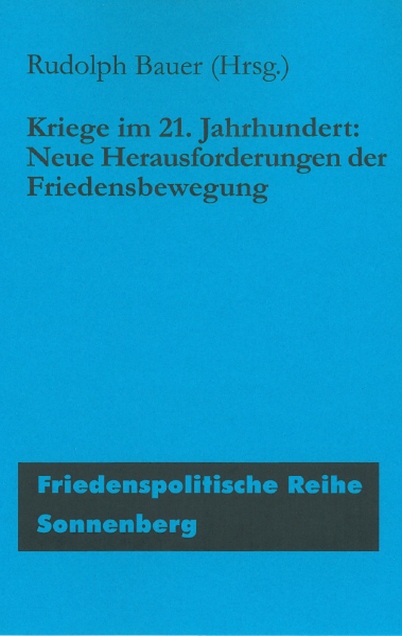 5. Cover: »Kriege im 21. Jahrhundert. Neue Herausforderungen der Friedensbewegung.« Friedenspolitische Reihe. Band 01. Herausgeber: Rudolph Bauer. Sonnenberg Verlag - Barbarossastr. 17 - 76855 Annweiler am Trifels. Sammelband zur Antikriegskonferenz in Berlin, mit Beiträgen von:
