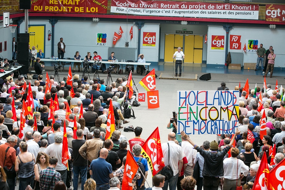 4. Protestveranstaltung: Les syndicats opposés à la loi Travail tenaient un meeting au gymnase Japy, à Paris, le 6 juillet 2016. Foto: Gewerkschaftsverband Force Ouvrière (FO). Quelle: Flickr. Verbreitung mit CC-Lizenz Namensnennung-Nicht kommerziell 2.0 Generic (CC BY-NC 2.0).