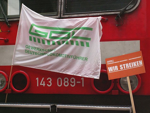 1. Schild zum Warnstreik der Gewerkschaft Deutscher Lokomotivführer (GDL) an einer Lokomotive. Foto: bigbug21. Quelle: Wikimedia Commons. Diese Datei ist unter der Creative-Commons-Lizenz „Namensnennung – Weitergabe unter gleichen Bedingungen 2.5 generisch“ (US-amerikanisch) lizenziert.