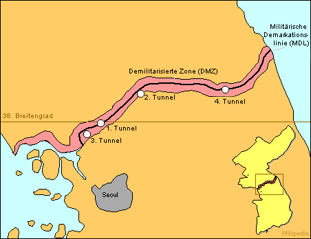 2. Die demilitarisierte Zone (DMZ) teilt die Koreanische Halbinsel de facto in Nord- und Südkorea auf. Sie wurde nach dem drei Jahre dauernden Koreakrieg im Jahre 1953 eingerichtet und läuft von West-Südwest nach Ost-Nordost quer über die Halbinsel, wobei sie nördlich Seouls den 38. Breitengrad schneidet, der bis zum Kriegsausbruch die Grenze zwischen beiden Staaten bildete.