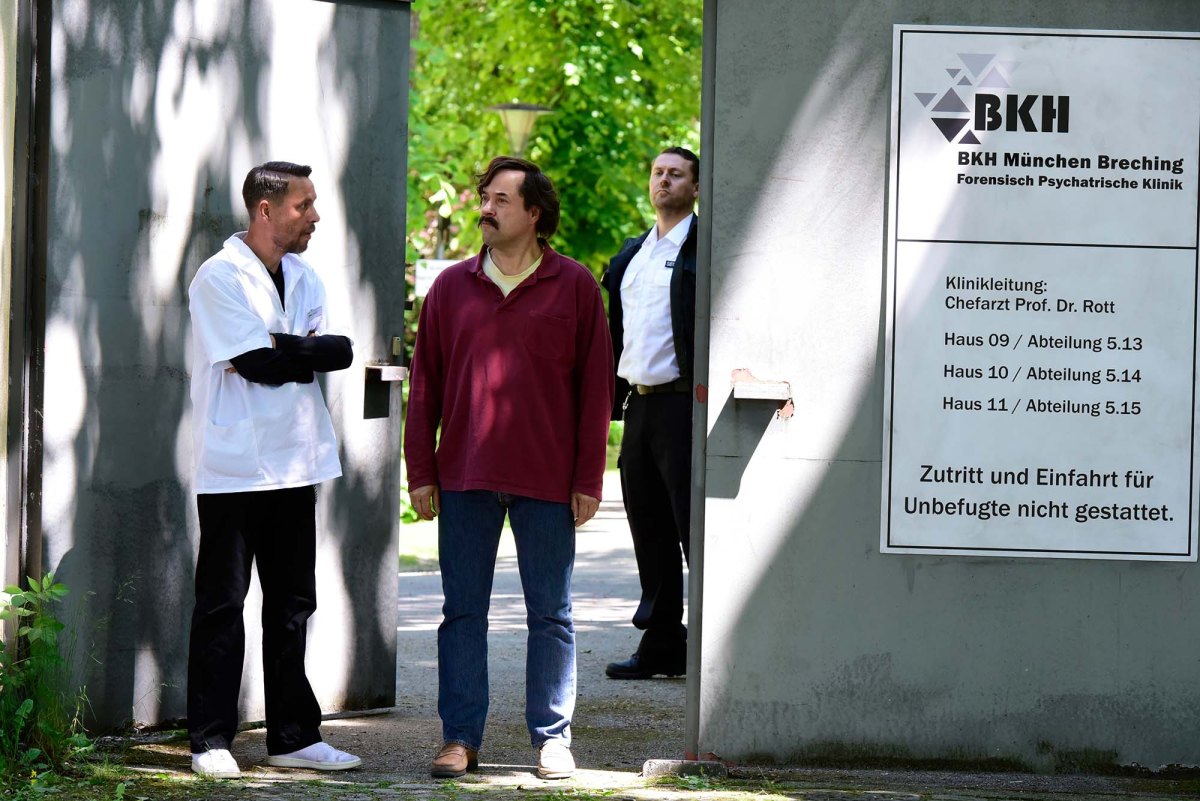 Sebastian Kronach (Jan Josef Liefers) wird von einem Pfleger (Tom Kreß) aus der Klinik entlassen. © ZDF, Jürgen Olczyk