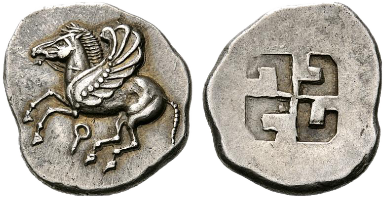 5a + b.: Corinthia, Corinth. Circa 550-500 BC. Stater (Silver, 8.61 g). Pegasos, with curved wing, flying to left; below, koppa. Rev. Incuse in the form of a swastika to left. BCD Corinth 3. Instead of walking, as on the earliest examples of this type, Pegasos is clearly flying here since all his hooves are diagonal and not flat on the ground. The swastika patterned incuse on the reverse is actually a very ancient solar symbol, found in many parts of the world, and has no political meaning.