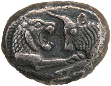 6. Silver croeseid issued by King Croesus of Lydia (561–545 BC), obverse: lion and bull protomes. Foto: Marie-Lan Nguyen / Jastrow. Quelle: Wikimedia Commons. Diese Datei ist unter der Creative-Commons-Lizenz „Namensnennung 2.5 generisch“ (US-amerikanisch) lizenziert.
