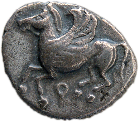7. Silver tridrachm from Corinth, ca. 515 BC, obverse: Pegasus flying left, with Greek letter qoppa (ϙ) below. Foto: Marie-Lan Nguyen. Quelle: Wikimedia Commons. Der Urheberrechtsinhaber veröffentlicht dieses Werk als gemeinfrei. Dies gilt weltweit.