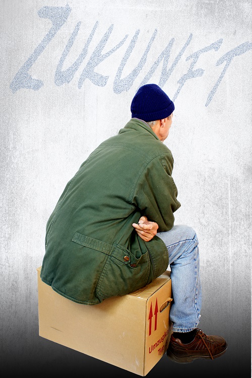 2. Mann auf Karton sitzend, über die Zukunft nachdenkend. Foto: Bernd Kasper. Quelle: Pixelio.de