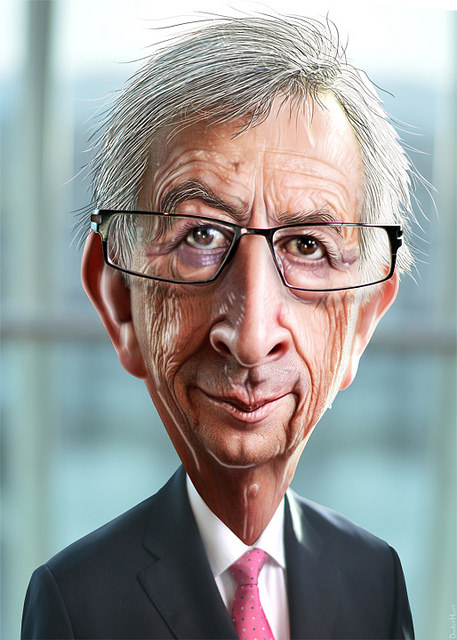 1. Jean-Claude Juncker - Caricature: Hinter dem Biedermann-Image, dem bis heute der langjährige luxemburger Premierminister und aktuelle EU-Präsident Jean-Claude Juncker sein harmloses Gesicht leiht, verstecken sich die üblichen Kapitalverbrechen: Große Waffendeals verlangen nun mal bei der Finanzierung und der ordentlichen Abwicklung die professionelle Hilfe von Banken. Urheber: DonkeyHotey. Quelle: Flickr. Verbreitung unter CC-Lizenz, Attribution 2.0 Generic (CC BY 2.0). The source image for this caricature of Jean-Claude Juncker is a Creative Commons licensed photo from the European People's Party Flickr photostream.
