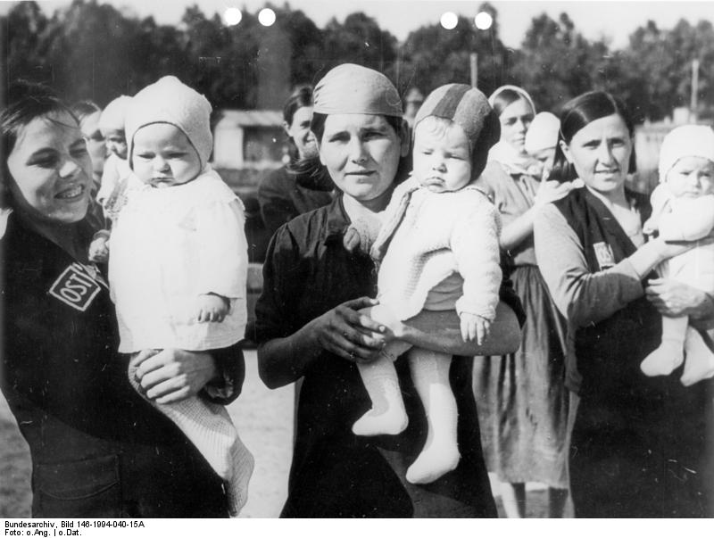 5. Ausländische Arbeitskräfte im III. Reich. Ostarbeiterinnen in Deutschland mit ihren Kleinsten nach Feierabend.