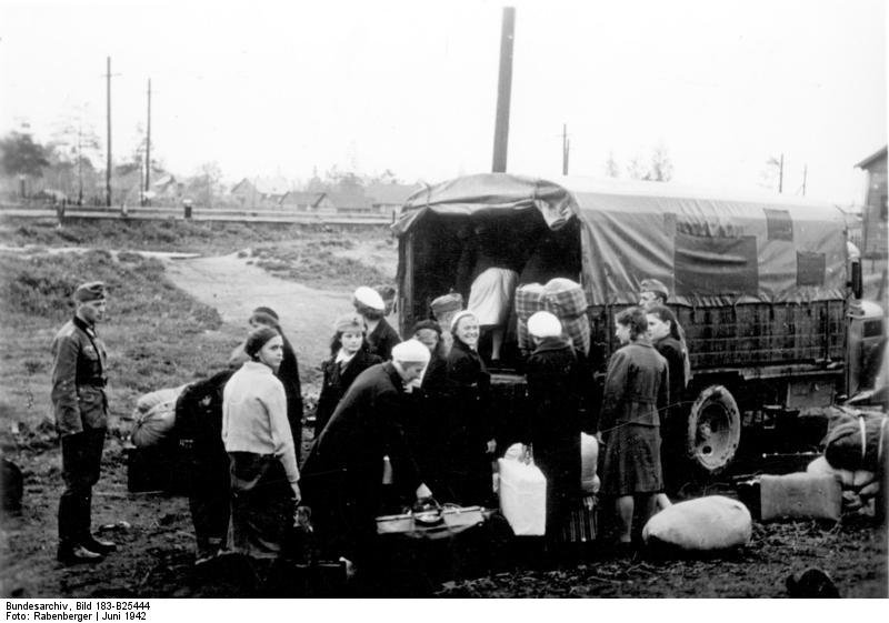 3. Russland, Abtransport von Ostarbeitern: Zentralbild II. Weltkrieg 1939-45 Juni 1942, Sowjetunion In den von den deutschen Faschisten besetzten Gebieten wurde die Zivilbevölkerung für die Arbeit in der deutschen Rüstung zwangsverpflichtet. U.B.z.: Der Abtransport mit LKW zur Bahnstation.