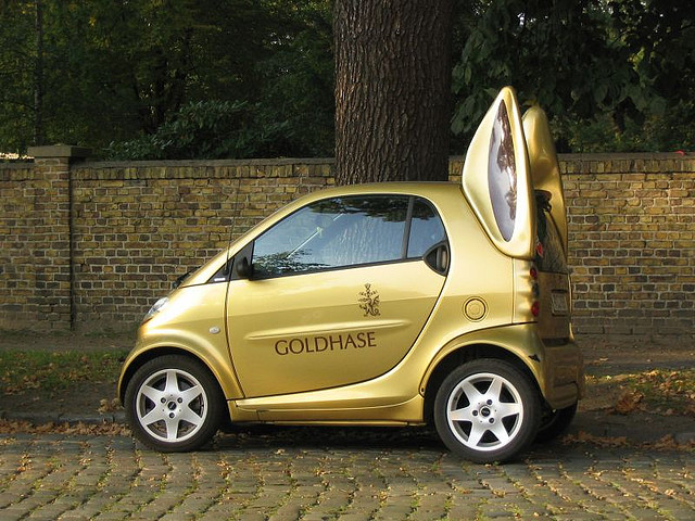 3. Auto mit Ohren - der Lindt Goldbunny. Die Schweizer Fa. Lindt & Sprüngli setzte solche Fahrzeuge auf Basis des Smart Fortwo in mehreren Ländern als schnuckelige Werbeträger ein. Foto: Flickr.-user _raina_ . Quelle: Flickr. Verbreitung mit CC-Lizenz Namensnennung - Weitergabe unter gleichen Bedingungen 2.0 Generic (CC BY-SA 2.0).