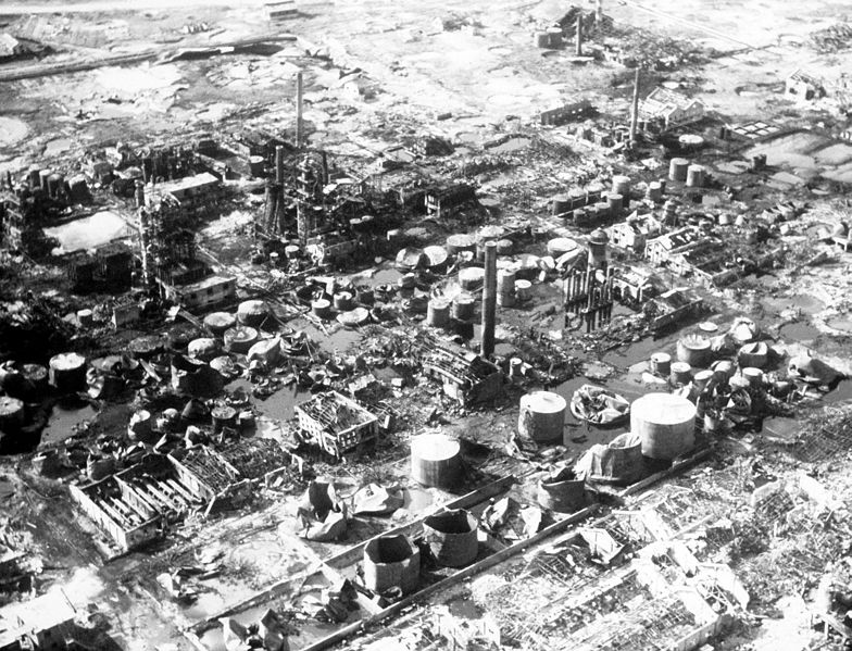 3. Air War in Korea. Ability of the North Korean military to keep its tanks and trucks operating in front lines was sharply cut when the Chosen Oil Refinery at Wonsan was bombed out of operation in four attacks in July and August by B-29 Superforts of the U.S. Far East Air Forces Bomber Command. The refinery provided almost all the finished petroleum products for Red mobile units. AIR AND SPACE MUSEUM#: 78122 AC. Foto: unbekannt. Quelle: Wikimedia Commons. Diese Datei ist ein Werk eines Mitarbeiters der Streitkräfte der Vereinigten Staaten oder des Verteidigungsministeriums der Vereinigten Staaten, aufgenommen oder hergestellt während seiner offiziellen Anstellung. Als amtliches Werk der Bundesregierung der Vereinigten Staaten ist dieses Bild gemeinfrei.