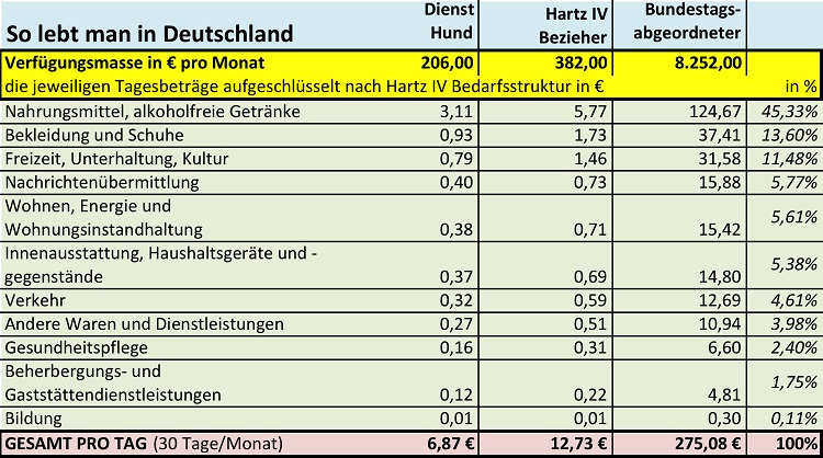 Aber verschaffen wir uns nun zunächst einen Überblick zum Lebensstil in Deutschland, in der wir die „typischen Deutschen mit einander vergleichen. Den deutschen Schäferhund, den deutschen Hartz IV-Bezieher und den gemeinen Bundestagsabgeordneten. Die monatlichen Bezüge der Hartz IV-Bezieher und der Bundestagsabgeordneten gehören ja zum Allgemeinwissen, weshalb wir hier keine weiteren Ermittlungs- und Quellennachweise dazu anführen.