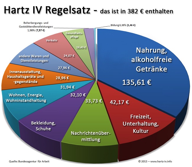 Wer sich jetzt noch weiter in die Bedarfsmaterie, speziell für Hartz IV-Bezieher einarbeiten möchte, weil die hier in der Darstellung möglicherweise etwas zu kurz gekommen sind, dem sei die Seite Hartz IV Info empfohlen, von dort ist auch letztere Tortengrafik rechts entlehnt, die zusätzlich die oben ausgewiesenen Anteile nochmals auf monatlicher Basis darstellt.