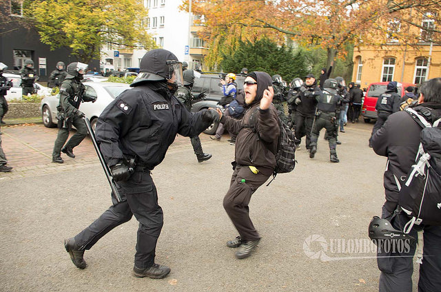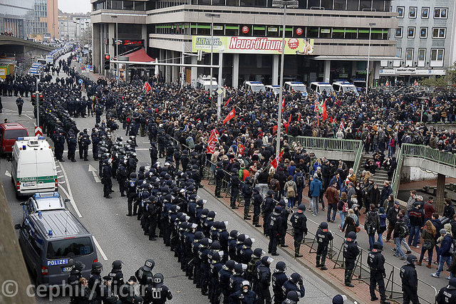 2. "Hooligans gegen Salafisten" und Gegenprotest in Hannover. Gegenproteste in Hörweite der HoGeSa-Kundgebung in Hannover. Foto: Michaela M., Quelle: Flickr. Verbreitung mit CC-Lizenz Attribution-NonCommercial-NoDerivs 2.0 Generic (CC BY-NC-ND 2.0)