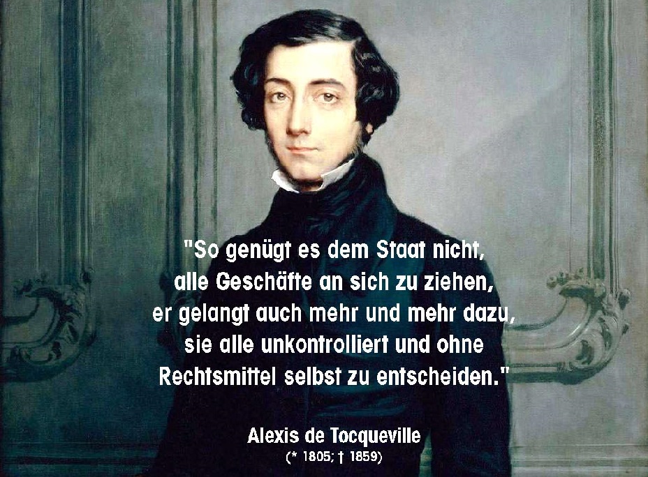 3. Alexis de Tocqueville: "Es ist wirklich schwer einzusehen, wie Menschen, die der Gewohnheit, sich selbst zu regieren, vollständig entsagt haben, im stande sein könnten, diejenigen gut auszuwählen, die sie regieren sollen." und "So genügt es dem Staat nicht, alle Geschäfte an sich zu ziehen, er gelangt auch mehr und mehr dazu, sie alle unkontrolliert und ohne Rechtsmittel selbst zu entscheiden."