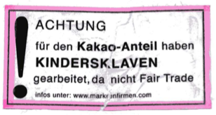 Die geschilderte Aktion, solch aufklärerische Aufkleber in Supermärkten auf die Schokoladen der entsprechenden Hersteller (das sind quasi alle; Ritter Sport kann man hier allerdings ausklammern) zu kleben, kann ich auch nur voll und ganz unterstützen.