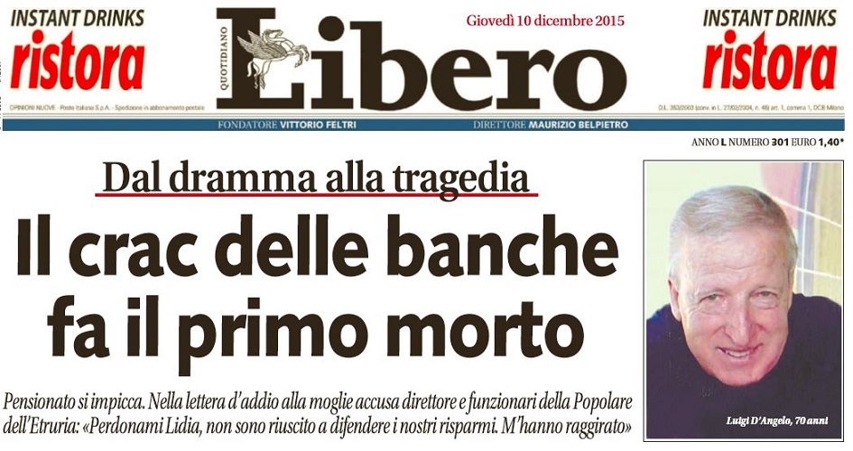Am 28. November 2015 kam es in Civitavecchia, einer italienische Hafenstadt in der Metropolitanstadt Rom in der Region Latium, zu einer folgenschweren Tragödie: Der Rentner Luigino d’Angelo beging Selbstmord und hinterließ einen Abschiedsbrief, in dem er erklärte er, dass er seine Lebensersparnisse in Höhe von 110.000 Euro auf Anraten der Banca dell´ Etruria in deren Produkte investiert und durch den Bail-in sein gesamtes Vermögen verloren habe. (⇒ zwei Artikel in italienisch - hier und hier).