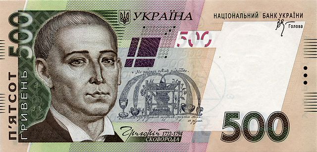 3. Fünfhundert-Hrywen-Schein: Den orangen Schein zu 500 Hrywen von 2006 ziert das Porträt von Hryhorij Skoworoda. Auf der Rückseite ist die Mohyla-Akademie abgebildet. Nach Kurs vom 6. Mär 2014 hat die 500-Hrywen-Note einen Gegenwert von 38,16 EUR, vom 5. Feb 2015 hat die 500-Hrywen-Note einen Gegenwert von 26,04 EUR. Quelle: Nationalbank der Ukraine / Wikimedia Commons.