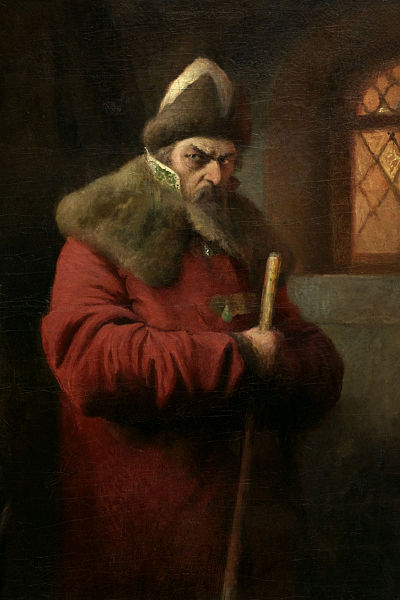 Durch tiefgreifende Reformen von Verwaltung, Rechtswesen und Armee stärkte Iwan IV. die Zentralgewalt und förderte den niederen Dienstadel auf Kosten der mächtigen Bojaren. Unter seiner Herrschaft expandierte das Zarentum Russland auf Kosten tatarischer Khanate beträchtlich nach Osten und Süden. Der erfolglose Livländische Krieg und der interne Terror hinterließen das Land jedoch in einem geschwächten Zustand. (Text: Wikipedia). Herkunft / Fotograf: http://smallbay.ru/artrussia/pelevin.html. Quelle: Wikimedia Commons. Der Urheber dieses Werks ist 1917 gestorben; es ist daher gemeinfrei, weil seine urheberrechtliche Schutzfrist abgelaufen ist.