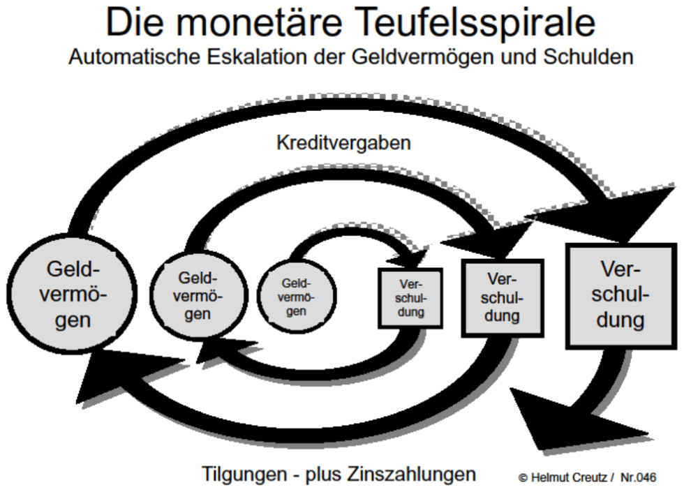 4. Grafik "DIE MONETÄRE TEUFELSSPIRALE" Automatische Eskalation der Geldvermögen und Schulden. © Helmut Creutz. Herzlichen Dank für die Freigabe zur Veröffentlichung im KN.